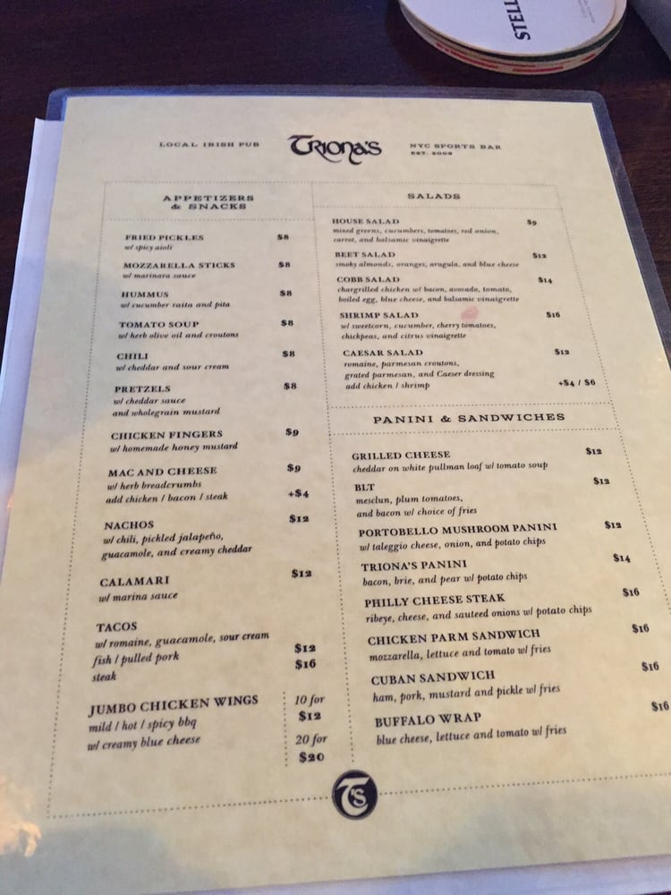 Introducing the menu at Triona's On Third, located in New York City, where casual dining meets vibrant nightlife. With a variety of appetizers like 3 Cheese Quesadilla, Boneless Chicken Wings, and Cajun Shrimp Skewers, your taste buds are in for a treat. Indulge in juicy burgers and hotdogs like the Classic Burger and Fried Chicken Burger, served with crispy fries or sweet potato fries. The cozy atmosphere with a full bar, pool table, and outdoor seating makes it perfect for group gatherings and happy hour specials. Customers rave about the friendly staff, strong drinks, and delicious appetizers like guacamole and pretzels. Whether you're here for a trivia night, football game, or just to unwind with friends, Triona's On Third promises a memorable dining experience.